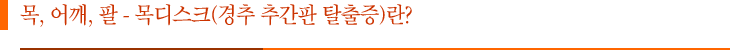 °æÃß Ãß°£ÆÇ Å»ÃâÁõÀº ¸ñ »À »çÀÌ¿¡ ÀÖ´Â ¹°··»ÀÀÎ Ãß°£ÆÇ(µð½ºÅ©)ÀÌ ¸ñÀÇ ÈÄ¹æ ¶Ç´Â ¿ìÃø¹æÀ¸·Î Å»ÃâµÇ¾î ô¼ö³ª °æÃ߽Űæ±ÙÀ» ¾Ð¹ÚÇÏ¿© ¸ñ°ú ¾î±ú ¹× »óÁöÀÇ ÅëÁõÀ» ÀÏÀ¸Å°´Â ÁúȯÀÔ´Ï´Ù. °¡Àå ¸¹ÀÌ ¹ß»ýÇÏ´Â ºÎÀ§´Â ¿îµ¿ÀÌ ¸¹Àº Á¦ 5~6 ¹× 6~7°æÃß·Î ÀÌ °æ¿ì¿¡´Â ¸ñÀÇ ÅëÁõº¸´Ù´Â ÆÈ°ú ¼ÕÀ¸·Î ³»·Á°¡´Â ÅëÁõ°ú Àú¸²ÀÌ ÁÖ Áõ»óÀÔ´Ï´Ù. µå¹°Áö¸¸ Á¦ 3~4 ¹× 4~5°æÃß¿¡¼µµ ¹ß»ýÇÏ´Â µ¥ ÀÌ °æ¿ì¿¡´Â ¼Õ±îÁö´Â ³»·Á°¡Áö ¾Ê°í º¸Åë ¾î±ú¿Í µî¿¡ ÅëÁõÀÌ ³ªÅ¸³³´Ï´Ù.